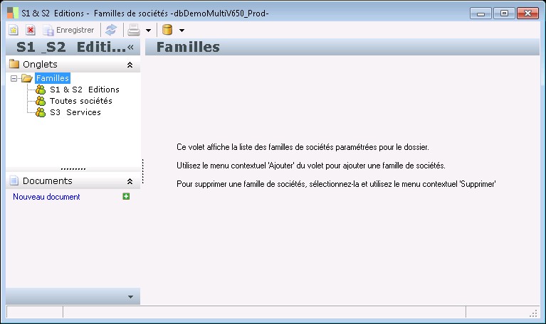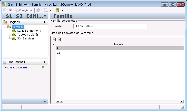 La fonction Familles de sociétés permet de regrouper plusieurs sociétés au sein d'une mêmefamille. La notion de famille est utilisée lors des restitutions. La sélection d'une famille permet de sélectionner rapidement les sociétés à restituer, plutôt que de les sélectionner manuellement une à une.