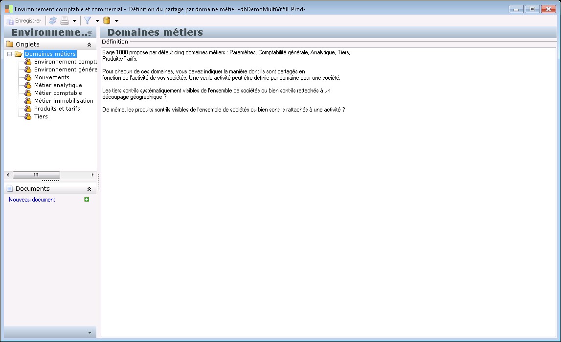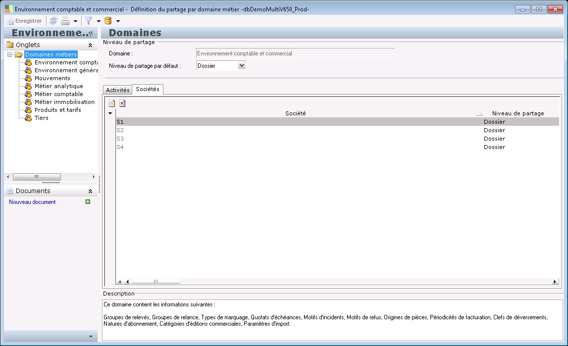 Les domaines Environnements général et Mouvements ne peuvent pas être paramétrés. Ils ne sont donc pas accessibles par cette fonction. Le domaine Environnement général est de niveau Dossier. Le domaine Mouvements est de niveau Société. |
