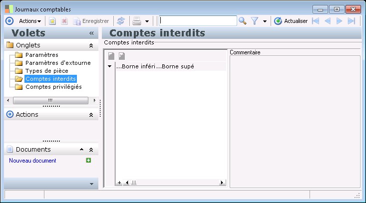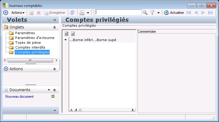 Il est possible de rattacher à un journal des fourchettes de comptes interdits. Ces comptes ne pourront pas être sélectionnés en saisie d'écritures comptables.la même façon, il est possible de définir des fourchettes de comptes privilégiés.Il s'agit des comptes qui seront le plus utilisés sur le journal considéré.dans les paramètres comptables, la case "Présentation des comptes privilégiés uniquement en saisie d'écritures" est cochée, l'application présentera par défaut dans tous les écrans de saisie les comptes privilégiés par journal.il est toujours possible de visualiser tous les comptes : par un clic droit sur la zone compte dans chacun des écrans de saisie, il suffit de décocher la fonction "Comptes priivilégiés par journal".