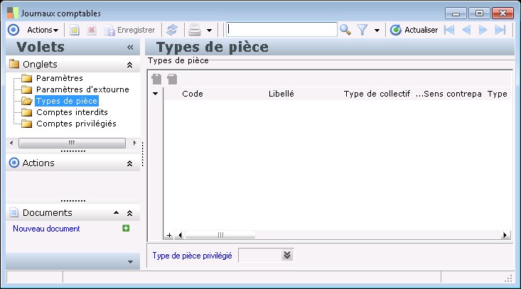 Enfin, il faudra associer à un journal un ou plusieurs types de pièce en indiquant un type de pièce privilégié. Ce dernier sera proposé automatiquement en saisie suite au choix du journal.