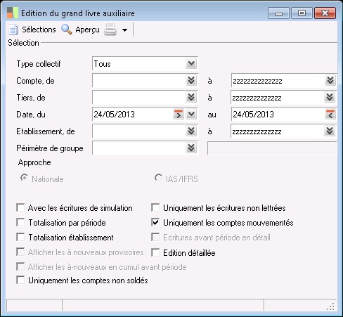 Cette fonction permet l'édition du Grand-Livre auxiliaire regroupant le détail des écritures passées sur les comptes de tiers.