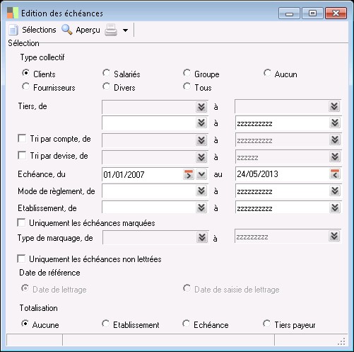 Le radio bouton "Date de référence" permet de déterminer la date à utiliser dans l'édition des échéances non léttrées pour considérer le lettrage.
