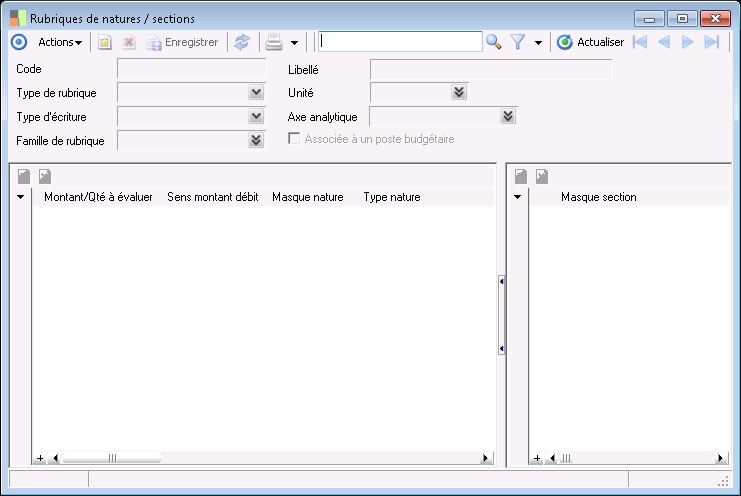 - des rubriques en quantité : ces rubriques portent sur les quantités imputées sur les couples comptes / sections. Dans ce cas, il est obligatoire de renseigner une quantité.