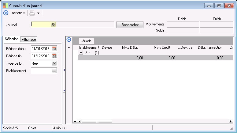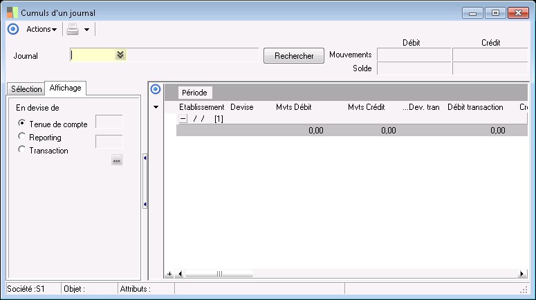 La fenêtre Cumuls d'un journal permet la consultation des cumuls du journal comptable sélectionné.