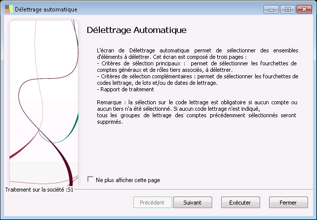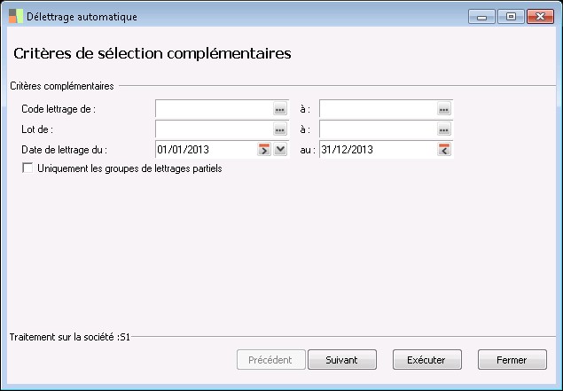 Il est possible d'effectuer une sélection sur le code lettrage. Cette sélection est obligatoire si aucun compte ou aucun tiers n'a été sélectionné. Si aucun code lettrage n'est indiqué, tous les groupes de lettrage des comptes précédemment sélectionnés seront supprimés. |