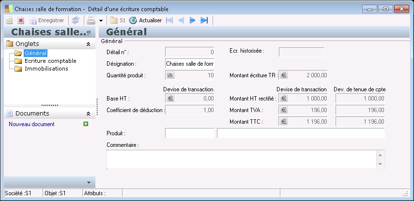 La fenêtre Détail d'une écriture comptable est composée de 3 dossiers :