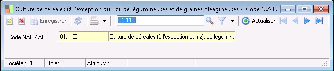 La fenêtre de saisie des codes NAF (ex codes APE) permet d'enregistrer le code et la désignation du code.