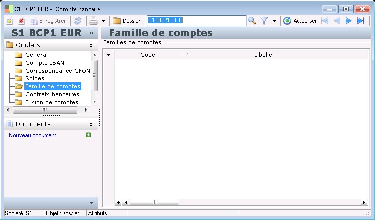 Ce dossier permet de consulter les familles de comptes auxquelles participe ce compte. Elles sont créées dans le menu Paramètres / Banques / Familles de comptes .