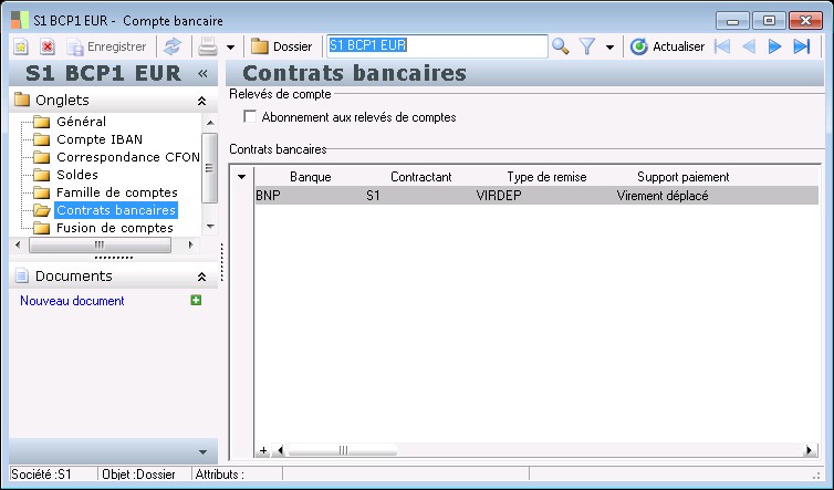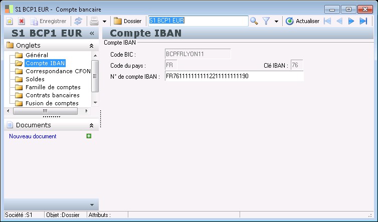 Ce dossier est disponible pour tous les comptes appartenant à une banque pour laquelle on a coché l'option Gestion CFONB (le RIB des comptes de banques françaises n'est pas modifiable ici).
