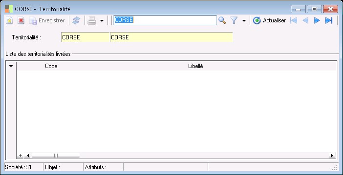 Cette fenêtre s'ouvre à partir de la liste ouverte par la fonction Paramètres / Généraux / TVA et Taxes / Territorialités des taxes .