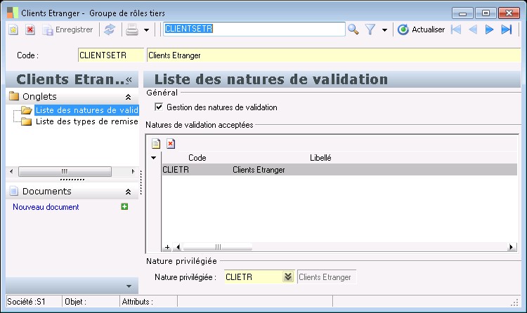 La nature de validation regroupe les règles de validation d'ordres et de remises bancaire propres à un ou plusieurs groupes de validation. Un groupe de validation est affecté par rôle tiers (Client, Fournisseur, Intra-groupe etc.)