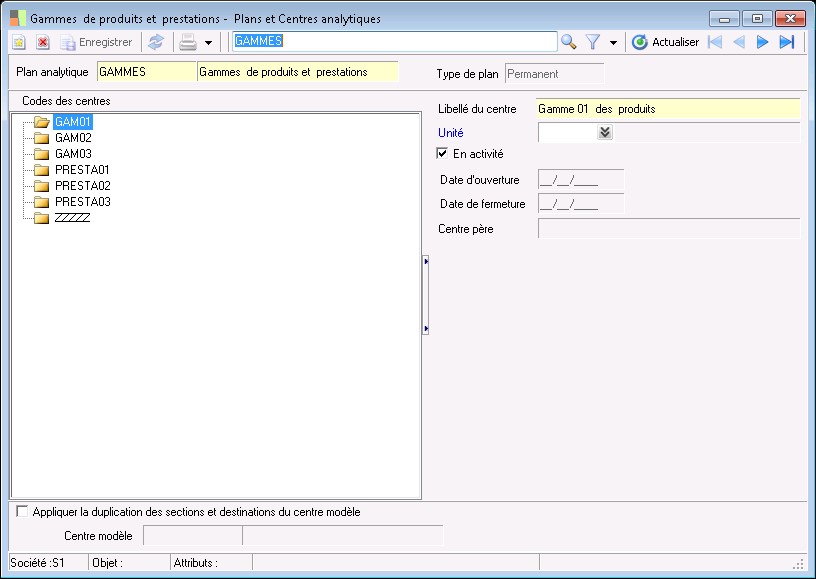 Le centre modèle sert de base lors de la création d'un nouveau centre analytique : les cohérences centre/centres et centre/nature de flux du centre modèle sont reprise pour le nouveau centre. Les sections et destinations du nouveau centre sont automatiquement générées fonction du centre modèle.