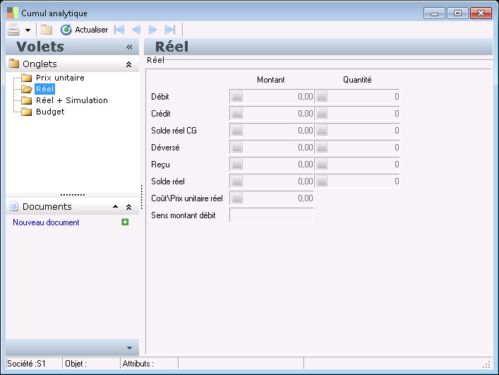 Le solde quantité réel CG est la différence entre le débit et le crédit en quantité des écritures de comptabilité générale réelle et des écritures analytiques pures de type pièce réel. Le signe négatif représente une quantité au crédit.