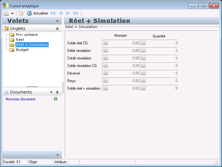 Le solde montant réel + simulation (Solde montant RS) représente le solde en montant des écritures réelles + simulation de comptabilité générale augmenté des écritures analytiques pures (écritures analytiques pures de type pièce réel ou simulation + les montants déversés et reçus) sur la destination analytique pour une période donnée (montants signés).