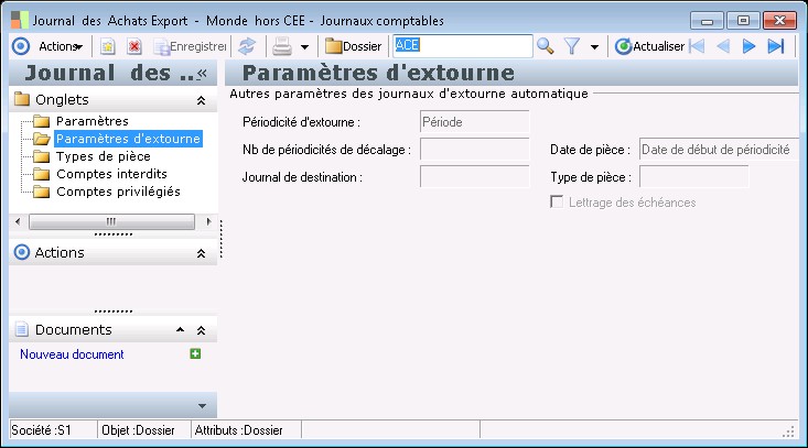 Le dossier Paramètres d'extourne concerneuniquement les journaux d'extournes automatiques. Il permet d'enregistrer les paramètres qui vont automatiser le processus d'extourne avec des indications comme la périodicité d'extourne, le nombre de périodicités de décalage et la date des pièces à générer.