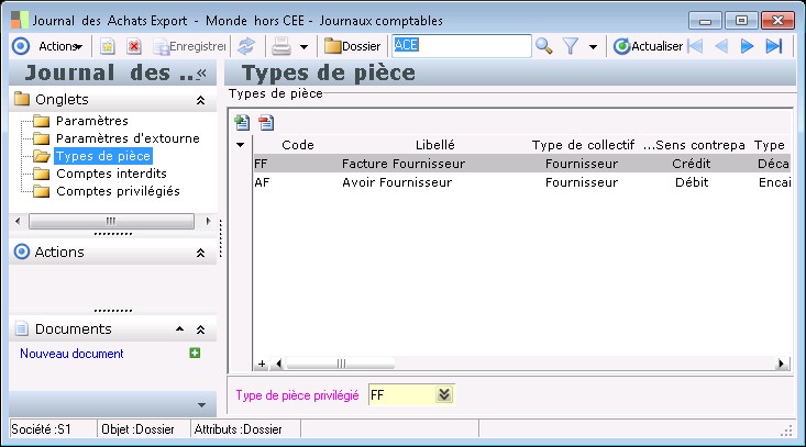 Un ou plusieurs types de pièce peuvent être rattachés aux journaux comptables. Pour chaque journal, on indiquera un type de pièce privilégié qui sera proposé par défaut en saisie des écritures suite au choix du journal. Il sera alors possible de modifier le type de pièce proposé par défaut en choisissant parmi la liste des types de pièce rattachés au journal.