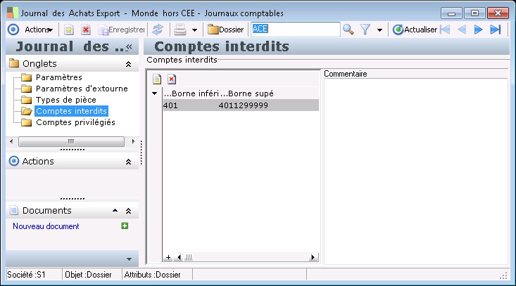 Dans le dossier Comptes interdits , vous pouvez interdire des comptes généraux par journal même si le journal est mouvementé. Les comptes interdits ne doivent pas avoir été mouvementés dans le journal considéré. Pour interdire des comptes généraux il vous suffit de créer ou de modifier les bornes, inférieure et supérieure, des comptes interdits.