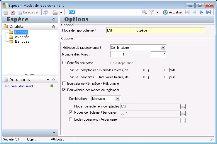 - Manuelle : permet de définir les modes de règlements (ou codes opérations interbancaires pour les écritures bancaires) à rapprocher.