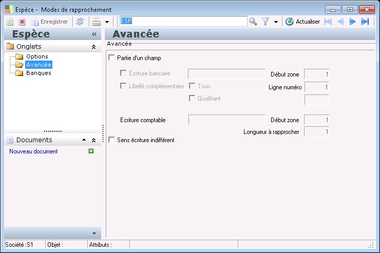 - Somme (N bancaires/1 comptable) : indique que le rappprochement automatique s'effectue en rapprochant une écriture comptable avec la somme de toutes les écritures bancaires.