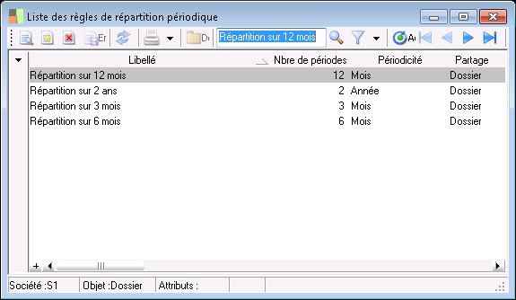 La fenêtre Règles de répartition périodiq ue est composée d'un tableau reprenant les colonnes suivantes :