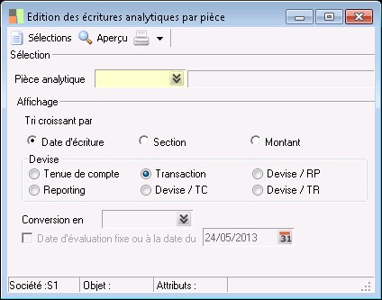 Cet élément n'est accessible que lorsqu'un choix Devise/TC, Devise/RP, ou Devise/TR a été coché dans le cadre "En devise de". On indique ici la devise d'affichage qui servira de base pour convertir les montants enregistrés en devise de Tenue de Compte, de Reporting ou de Transaction.