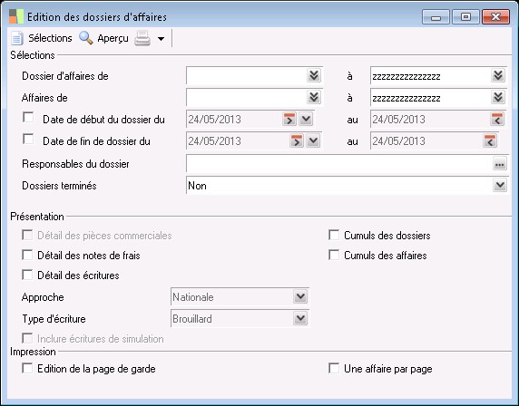 Cette fonction permet de lancer l'édition des dossiers d'affaires. Elle est lancée par la fonction Fichiers de base / Affaires / Dossiers d'affaires / Edition des dossiers d'affaires .