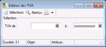 Cette fonction permet d'éditer la liste des TVA en fonction de certains critères de sélection. Elle est lancée par la fonction Impression de la liste et de la fiche des TVA, elles-mêmes accessibles au niveau du menu Paramètres / Généraux / TVA et taxes / TVA.