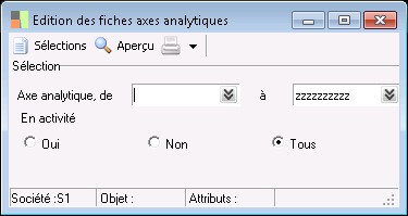 Indiquer le niveau d'activité des axes analytiques sélectionnés. Il est possible d'éditer que les axes analytiques actifs, que les inactifs ou tous les axes analytiques.