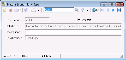 La fenêtre de saisie des nature économiqueSEPApermet d'enregistrer le code et la désignation de nature économiqueSEPA.