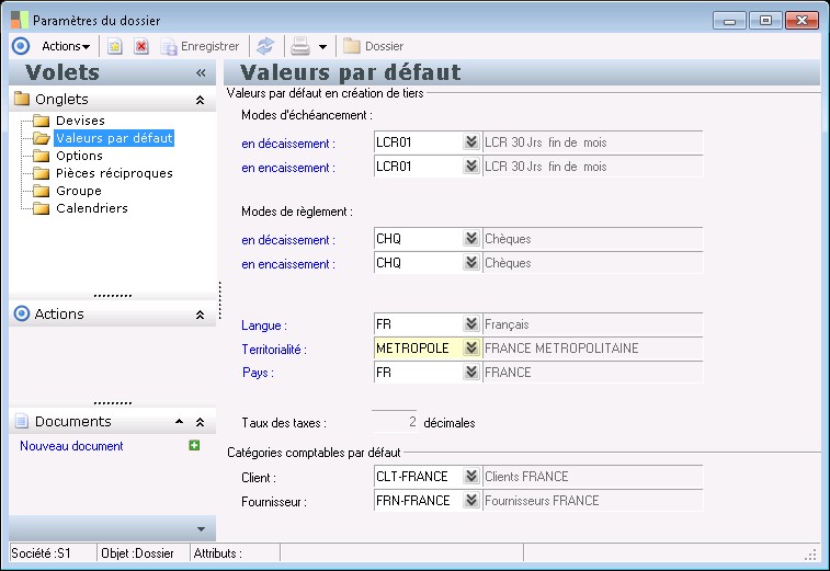 Cette zone indique la territorialité de la société vis-à-vis du calcul des taxes : Elle sert à déterminer le régime de TVA en pièce commerciale (en combinaison avec la territorialité liée à l'adresse du tiers concerné par la pièce).