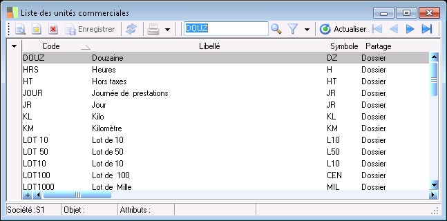 Cette liste s'ouvre à partir de la fonction Paramètres / Généraux / Unités / Unités commerciales .