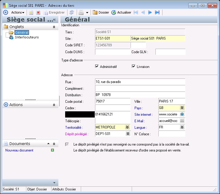 Général : il est nécessaire de préciser si l'adresse enregistrée est administrative et/ou destinée aux réceptions/livraisons de produits.
