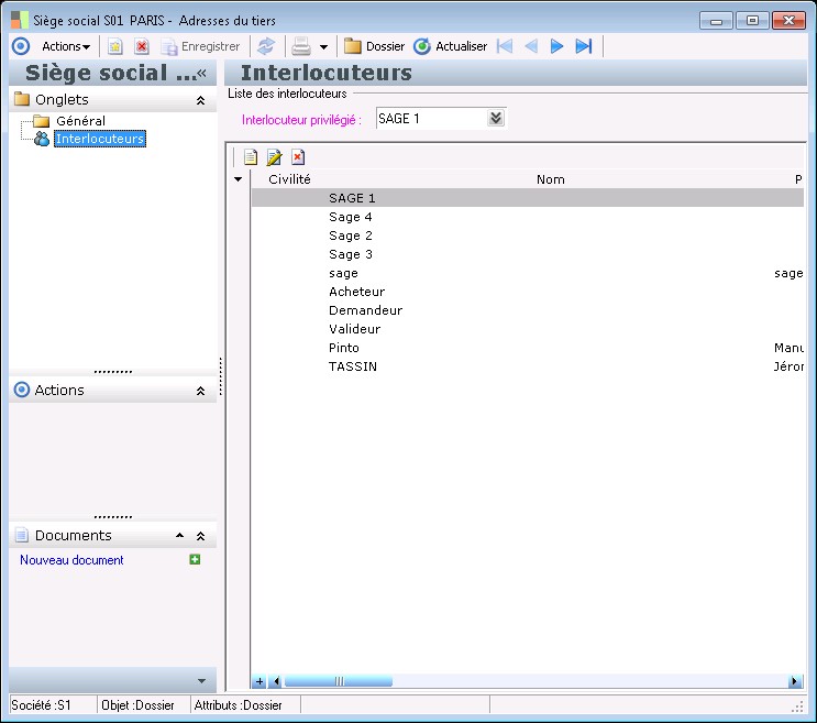 Interlocuteurs : pour ajouter un interlocuteur, utilisez la commande Créer interlocuteur du menu contextuel de ce volet ou du menu Actions ou encore cliquez sur le bouton Créer au-dessus de la grille.
