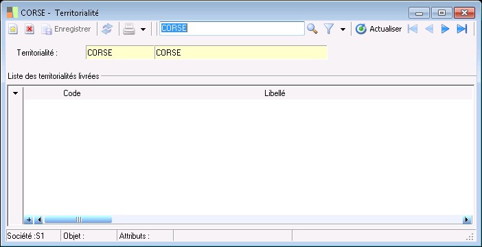 Cette fenêtre s'ouvre à partir de la liste ouverte par la fonction Paramètres / Généraux / TVA et Taxes / Territorialités des taxes .