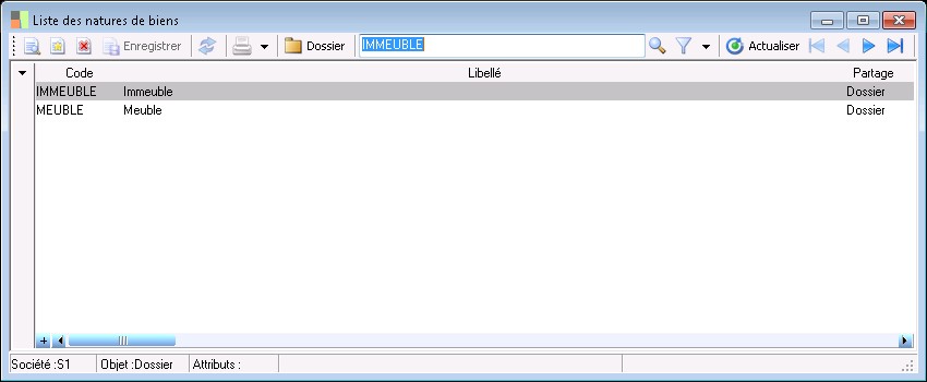 Cette fenêtre affiche la liste des natures de bienenregistrés dans l'application et permet leur modification ou la création de nouvelles natures.