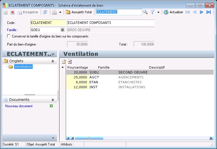 Cette zone non saisissable présente le total des pourcentages répartis entre le bien origine (bien structure) et les biens créés suite à l'éclatement (les biens composants).
