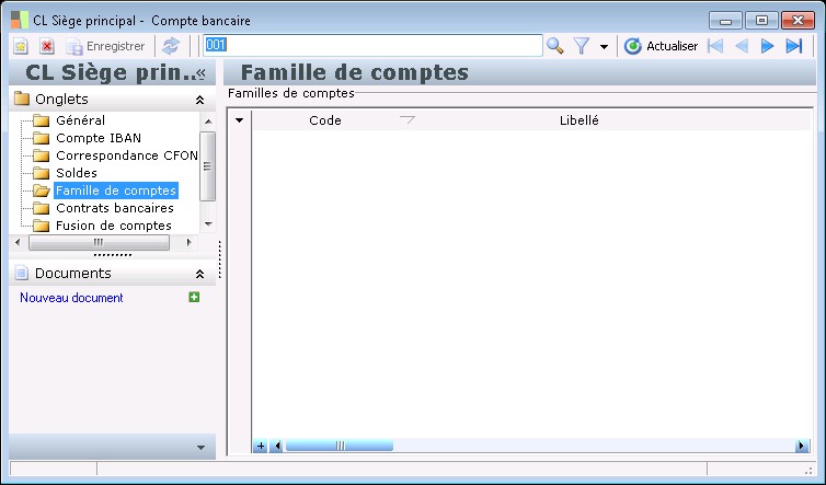 Ce dossier permet de consulter les familles de comptes auxquelles participe ce compte. Elles sont créées dans le menu Paramètres / Banques / Familles de comptes .