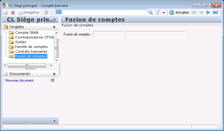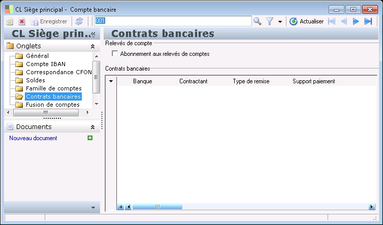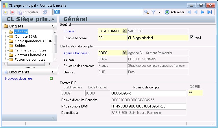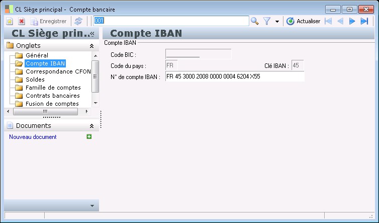 Ce dossier est disponible pour tous les comptes appartenant à une banque pour laquelle on a coché l'option Gestion CFONB (le RIB des comptes de banques françaises n'est pas modifiable ici).
