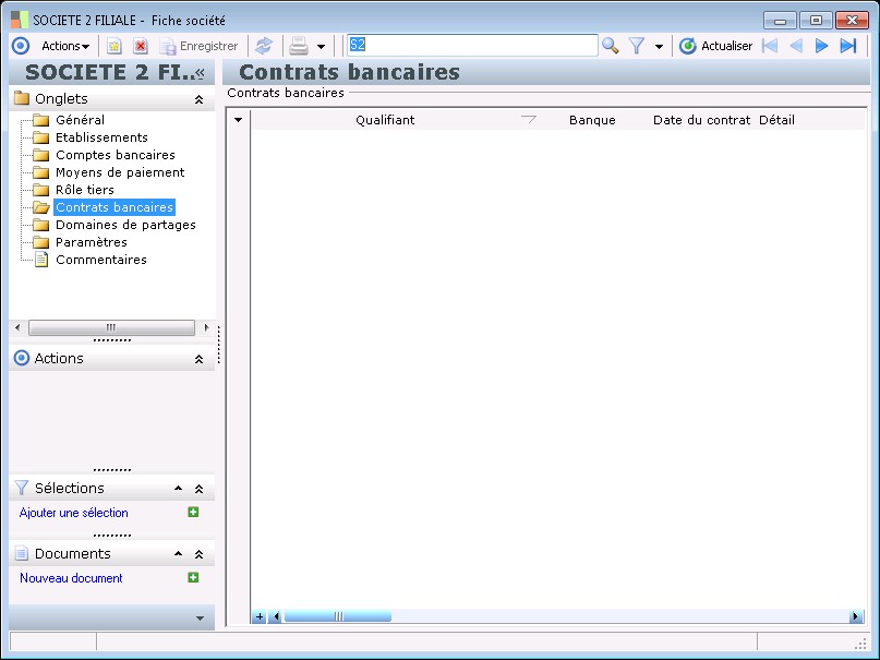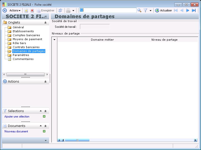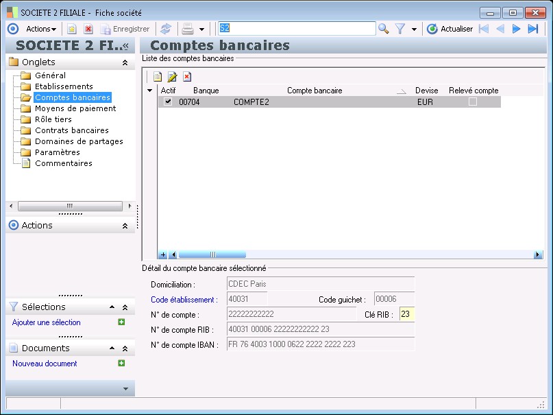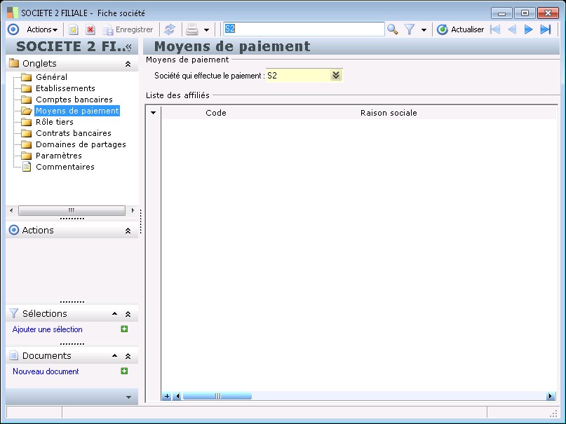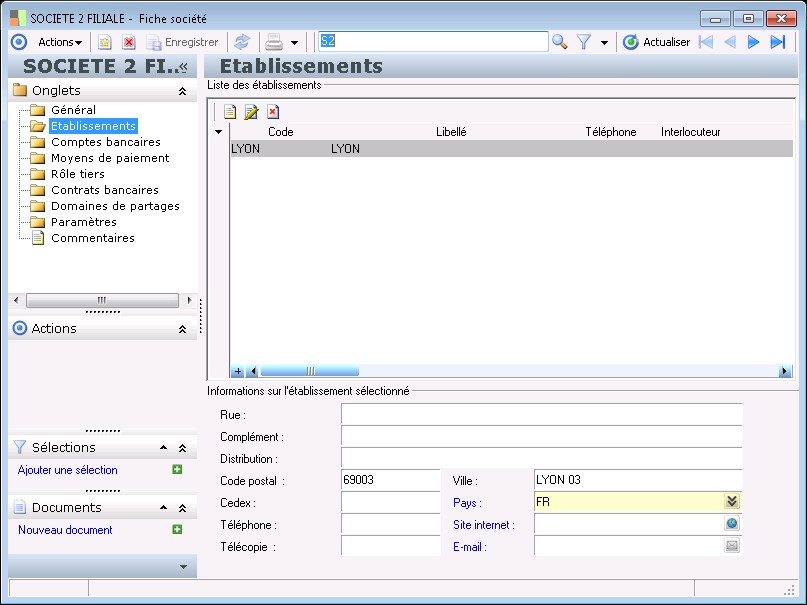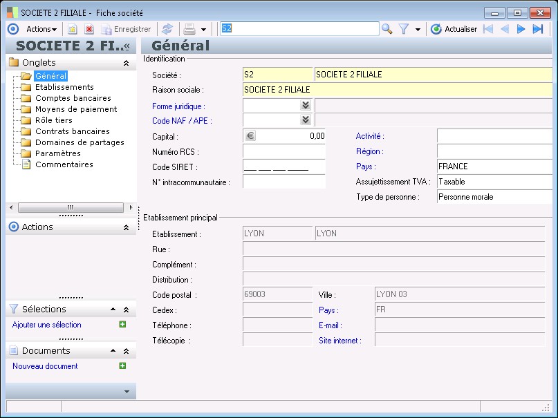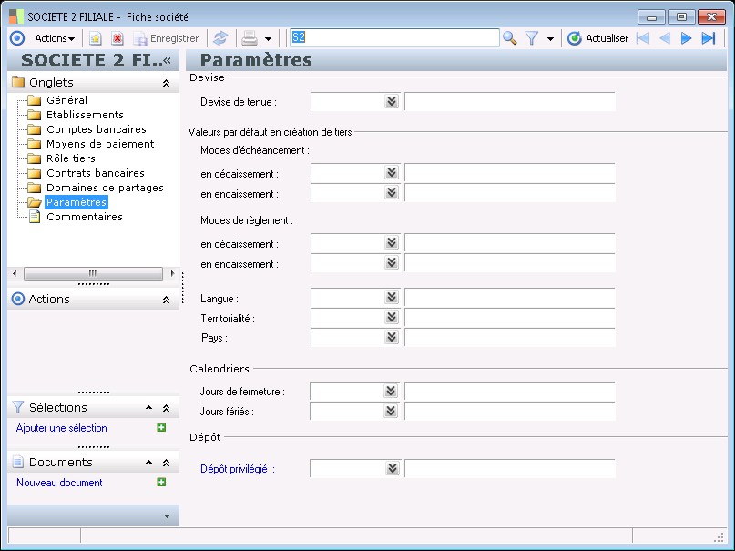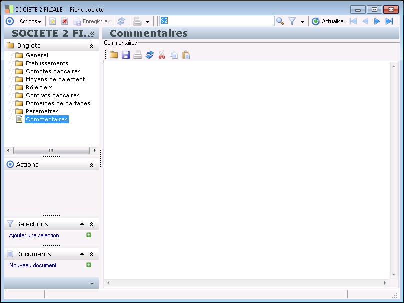 Dans la fenêtre Fiche société, la présence des fonctions décrites dans ce contexte dépend des applications installées.