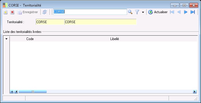 Cette fenêtre s'ouvre à partir de la liste ouverte par la fonction Paramètres / Généraux / TVA et Taxes / Territorialités des taxes .