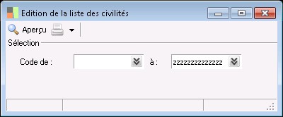 Cette fonction permet d'éditer la liste des civilités en fonction de certains critères de sélection. Elle est lancée par la fonction Impression de la liste et de la fiche des civilités, elles-mêmes accessibles au niveau du menu Paramètres / Société / Civilités.
