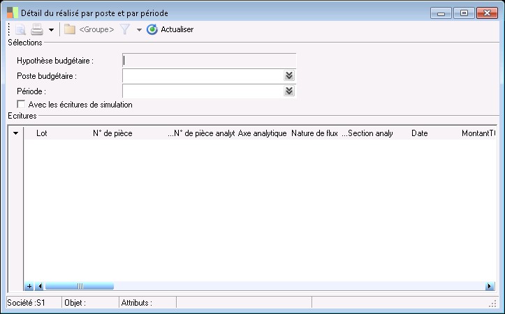 La fenêtre « Détail du réalisé par poste et par période »affiche le détail des écritures générales ou analytiques d'un montant réalisé de l'analyse budgétaire.
