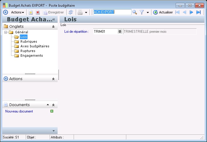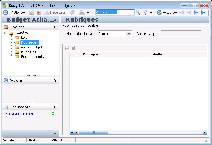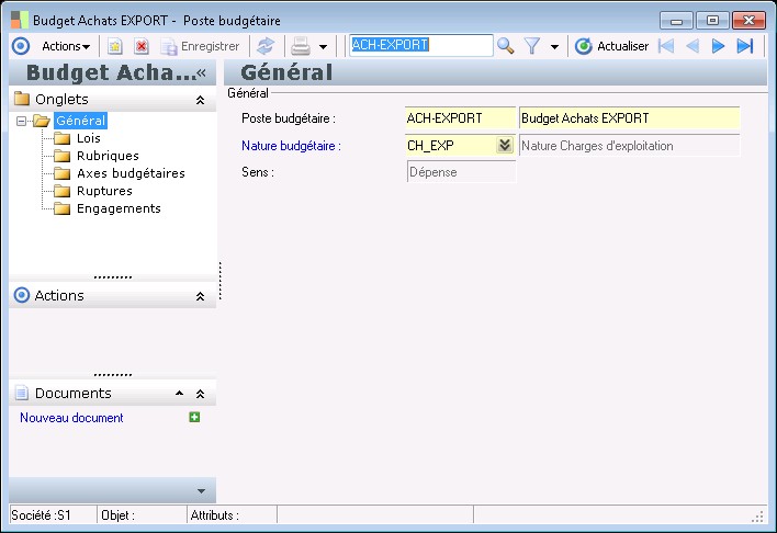 Cette fenêtre et tous les volets auxquels elle donne accès servent à l'enregistrement des données concernant un poste budgétaire : DossierGénéral Cedossierpermet de renseigner le code, le libellé et la nature budgétaire du poste. DossierLois Dans ce dossier, il est possible d'associer une loi de répartition au poste budgétaire,dans le but de répartir un montant budgété sur un exercice. DossierRubriques Le dossier Rubriques, permet l'association d'une ou plusieurs rubriques au poste budgétaire pour permettre la mise à jour du cumul réalisé. Trois natures de rubriques à associer sontproposées :