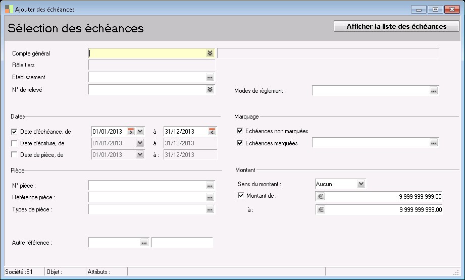 Cette fonction permetla recherche des échéances à lettrer pour un rôle tiers ou un compte général en proposant des critères de sélection,tels que :
