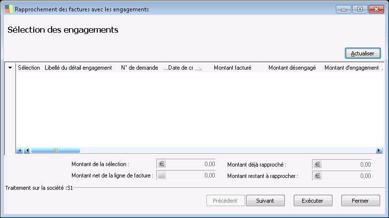 L'application affiche, en bas de la fenêtre, le montant de la ligne de facture, le montant des engagements déjà rapprochés et le montant restant à rapprocher.