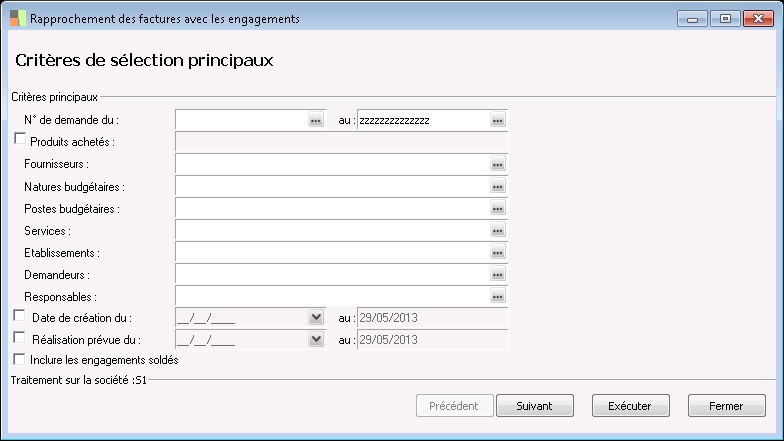 Cette fonction est accessible soit depuis la commande Etats des factures non rapprochées / Rapprocher des engagements du menu Engagement , soit depuis le menu contextuel des lignes de facture de la commande Saisie des factures ou Saisie des factures d'avoir dusous-menu Achat / Facturation .