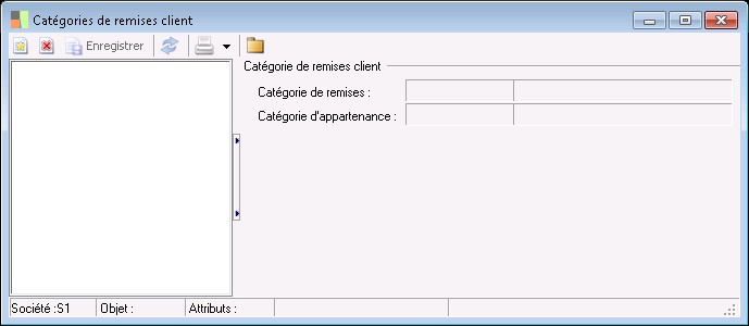 Cette fenêtre présente la liste des catégories liées aux clients permettant de définir la politique des remises. Elle est ouverte par la fonction Fichiers de base / Tarifs / Tarifs de vente / Catégories de remises clients .