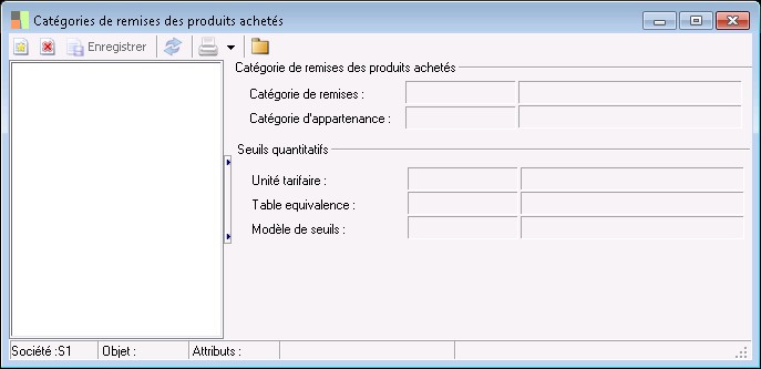 Cette fenêtre présente la liste des catégories liées aux produits achetés permettant de définir la politique de remises. Elle est ouverte par la fonction Fichiers de base / Tarifs / Tarifs d'achat / Catégories de remises produits .