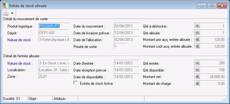 Cette zone indique la quantité allouable sur le mouvement d'entrée de stock. Son calcul est le suivant : quantité entrée - quantité allouée. Elle correspond à la sommation de la quantité livrable (disponible à la vente) et de la quantité allouable qui n'est pas encore livrable.