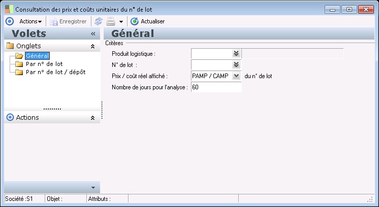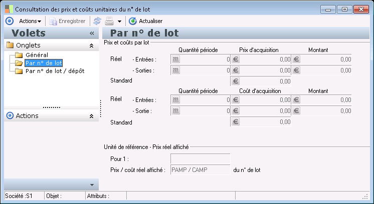 Cette fenêtre renseigne, en fonction d'une période donnée, sur les prix et coûts unitaires d'un produit comportant un numéro de lot soit globalement, soit par dépôt dans lequel le produit est stocké. Elle est ouverte par la fonction Prix et coût d'acquisition du menu Actions de la fenêtre « Gestion des numéros de lot ».